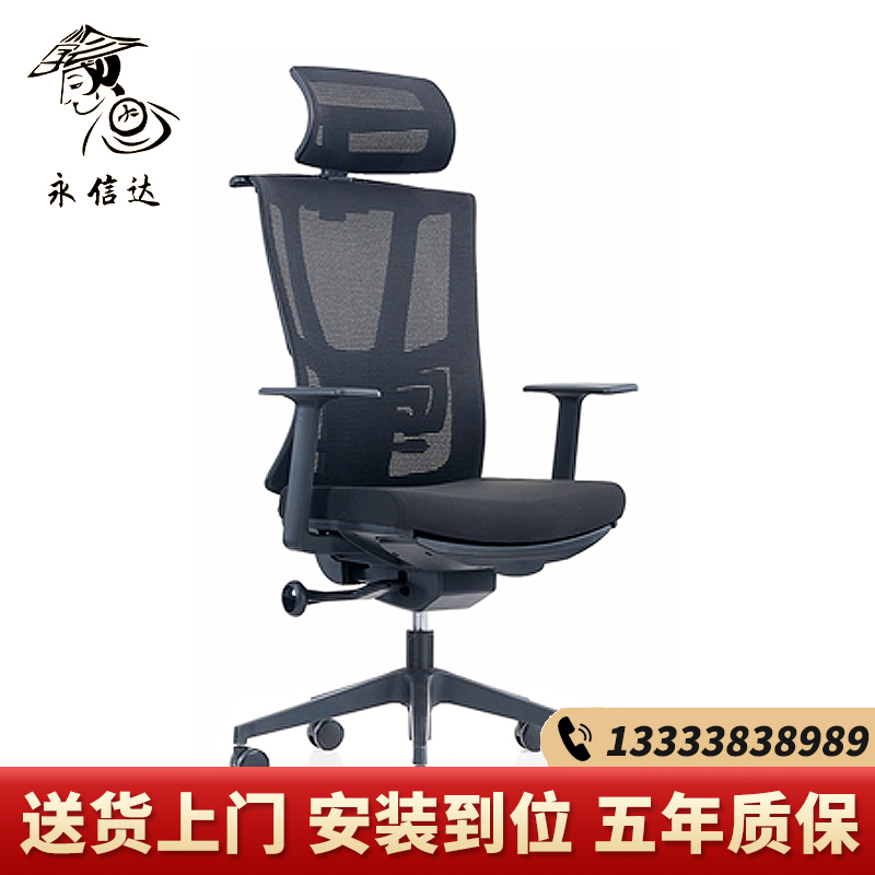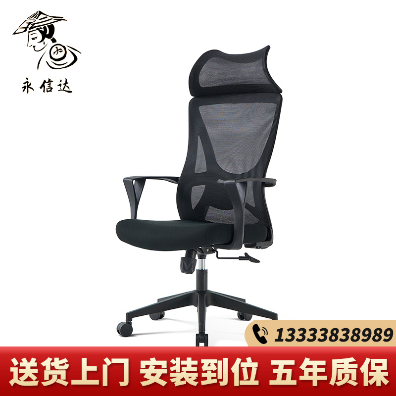 永信达 黑色网布靠背办公椅 头枕透气人体工学电脑椅舒适靠背椅